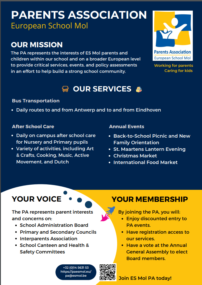 At the European School of Mol, the Parents’ Association “PA”, which is made up completely of Parent Volunteers, plays a key role in providing a variety of services (Daycare & Transport) for the children as well as representing the interests of your children. We are the interface between the parents, the school management, the various school committees, and the Board of Governors (which manages all European schools). We aim to provide parents with information and support and we meet regularly to discuss ongoing school issues.